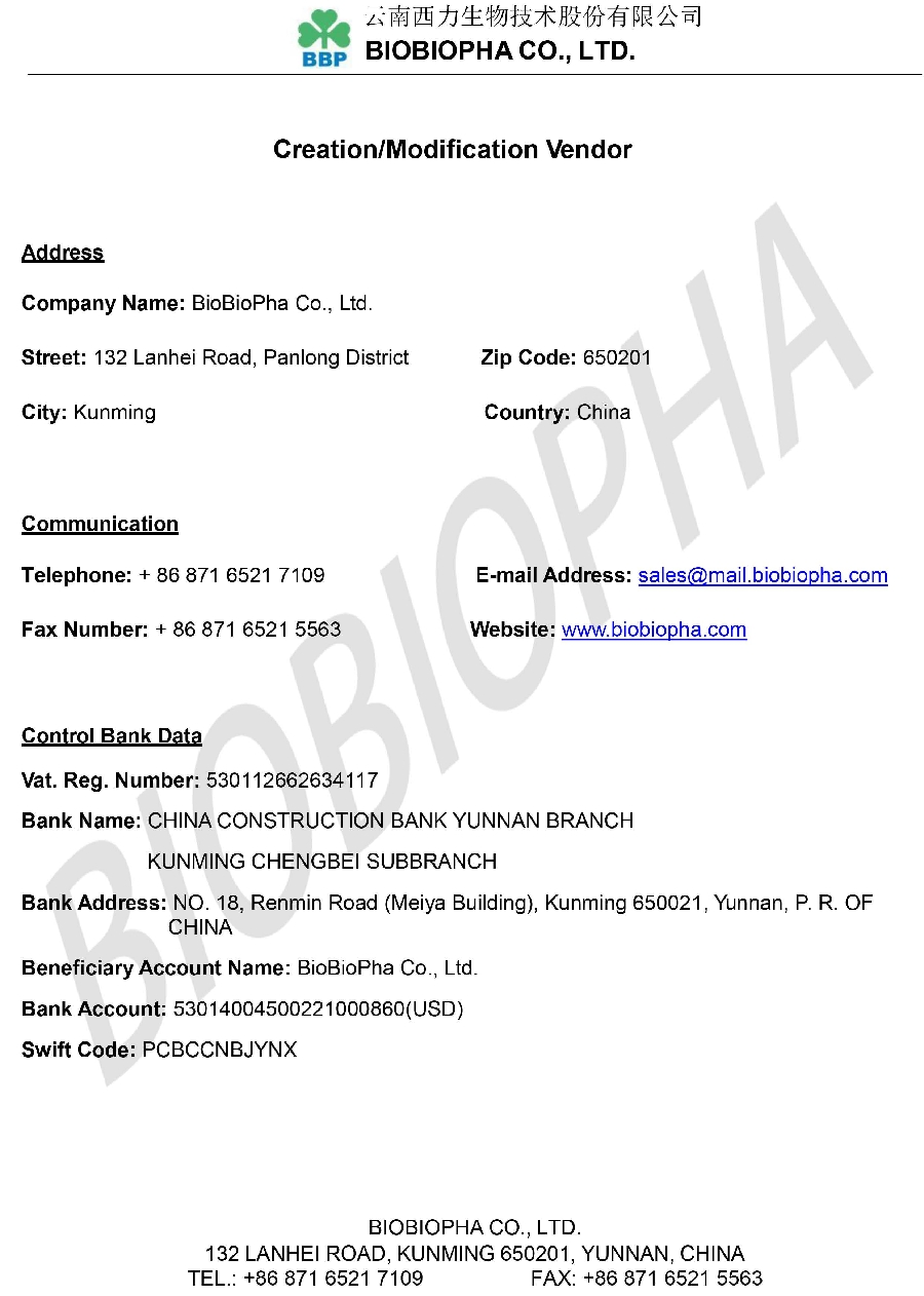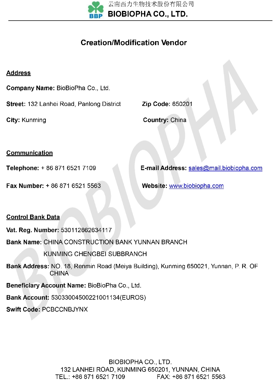 Statement: You are hereby formally notified that the following two bank accounts (in USD and Euro) are the only valid accounts of BioBioPha. We don’t accept any liability whatsoever for any loss arising from any changes on this payment account.